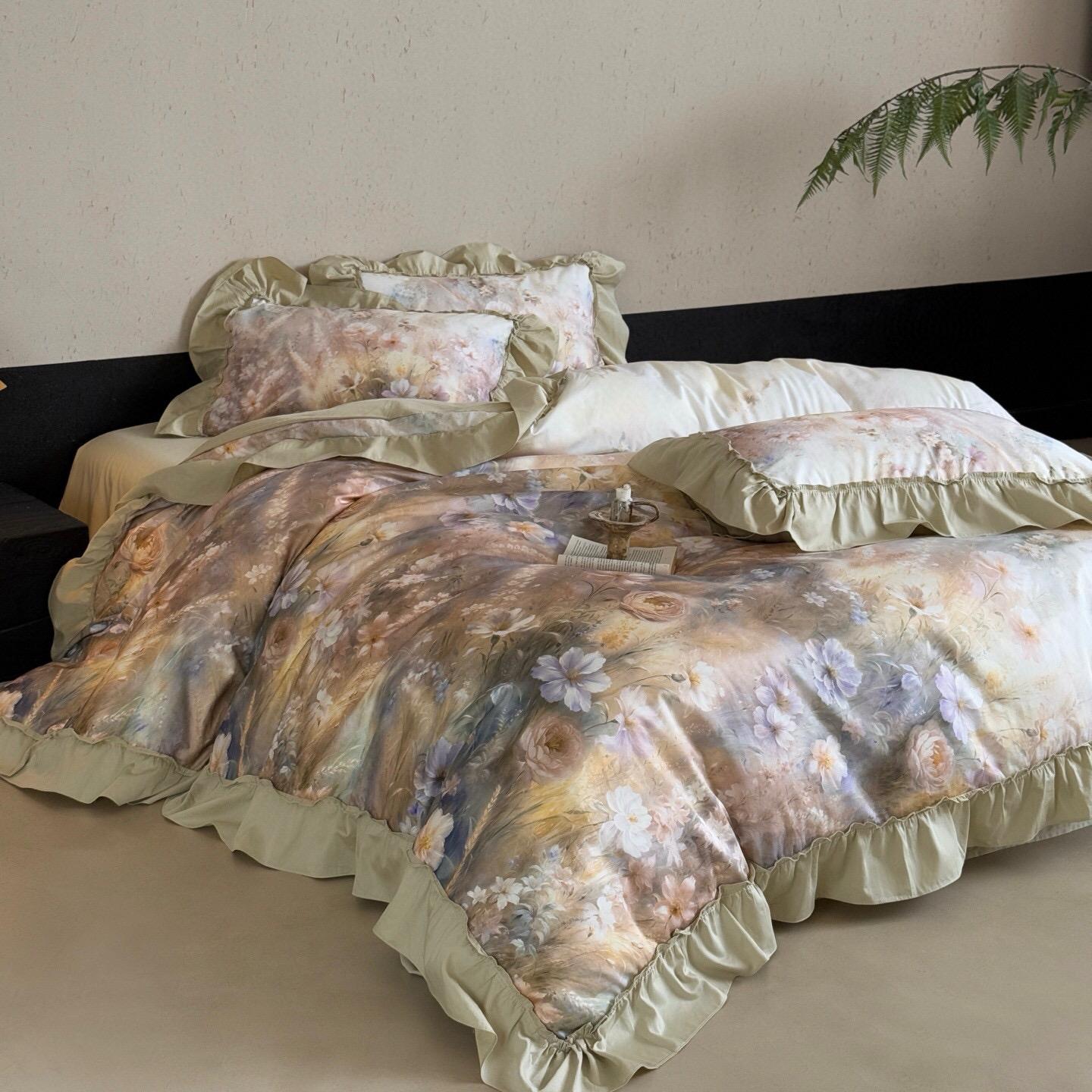 100% cotton home hotel textile green printing comforter cover with 2 high-end pillowcases coverlets ruffles bedding set manufacture