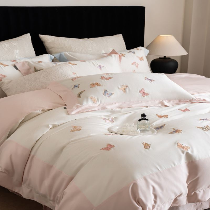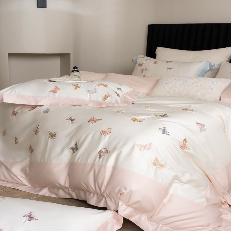 100 Long Staple Cotton Home Textile Butterfly Embroidery Duvet Quilt Cover High End Pink Bedding Set