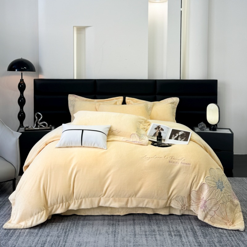 220g Milk Velvet Floral Embroidery Duvet Cover Queen King Bed Sheet Yellow Bedding Set