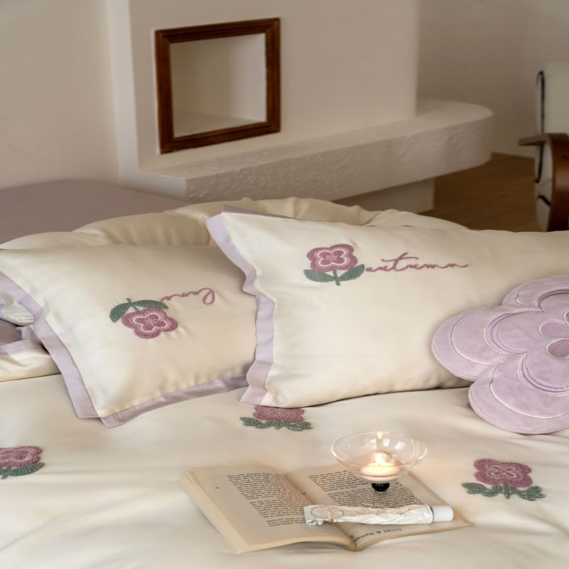 60-count lyocell floral plant embroidery comfortable breathable bed sheet bed linen four-piece white purple bedding set