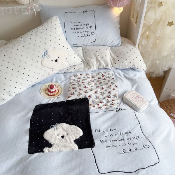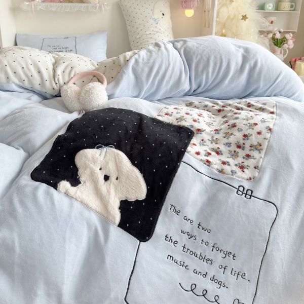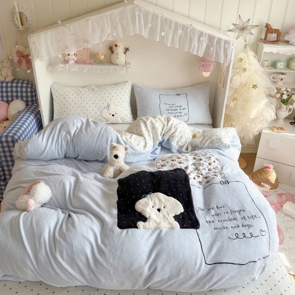 Cartoon embroidery duvet comforter cover blue bed sheets winter milk velvet bedding set