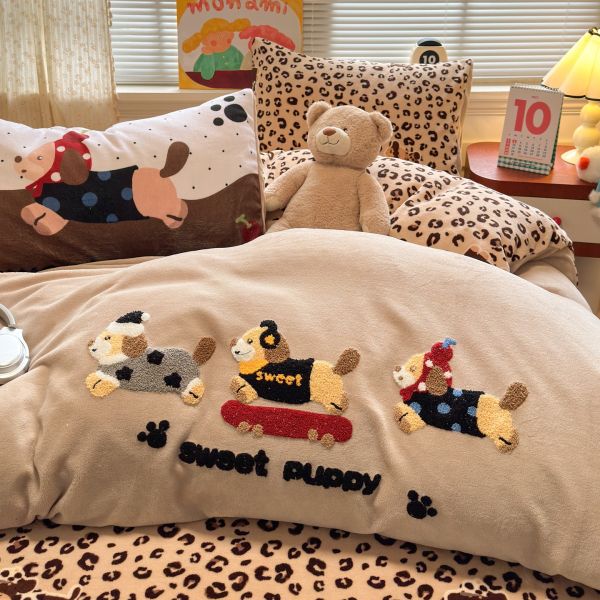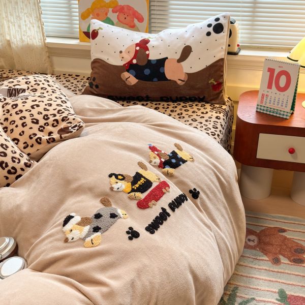 Cartoon towel embroidery duvet cover milk velvet bed sheets 4pcs bedding set