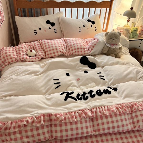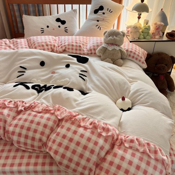 Cartoon towel embroidery milk velvet lace quilt cover soft and warm bed sheet queen king four-piece bedding set