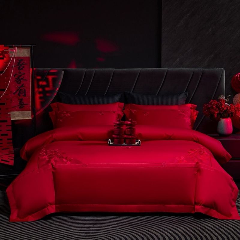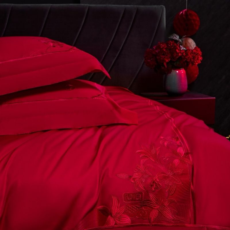 Custom 1800 Egyptian Cotton Satin Embroidered Duvet Cover Red Bed Sheets Wedding 4PCS Bedding Set
