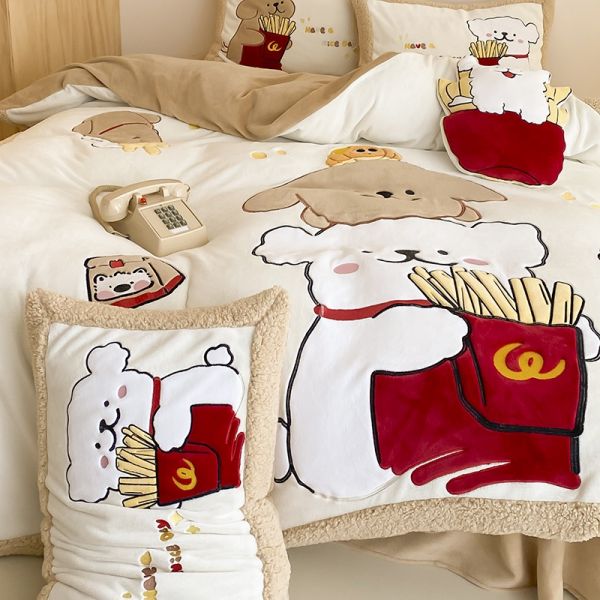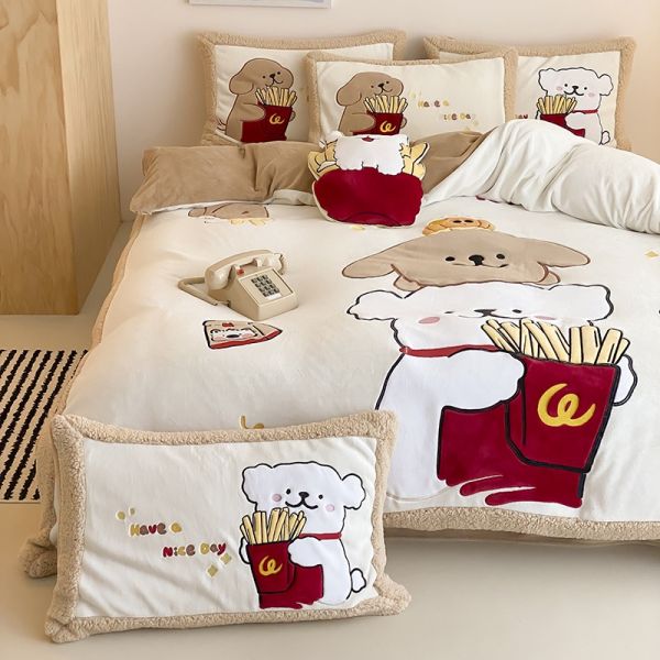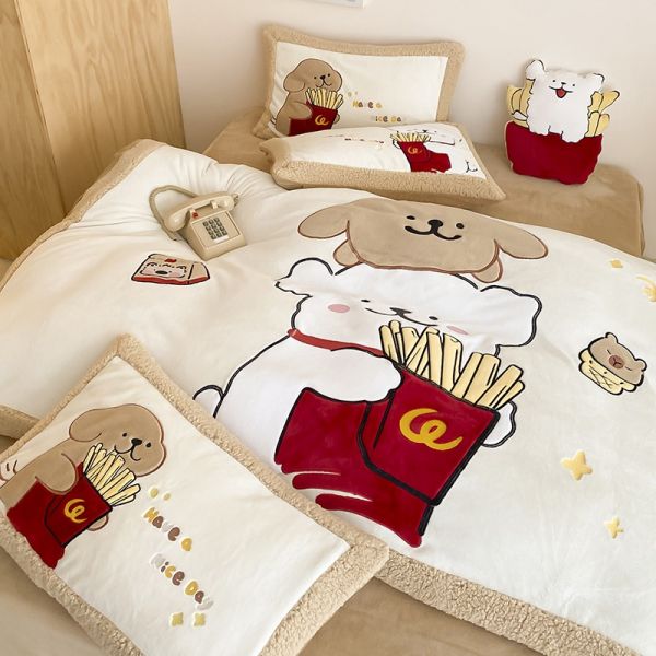 Cute 3D Heavy-Duty Embroidery Duvet Cover Milk Velvet Bed Sheet Three-Piece Bedding Set for Children