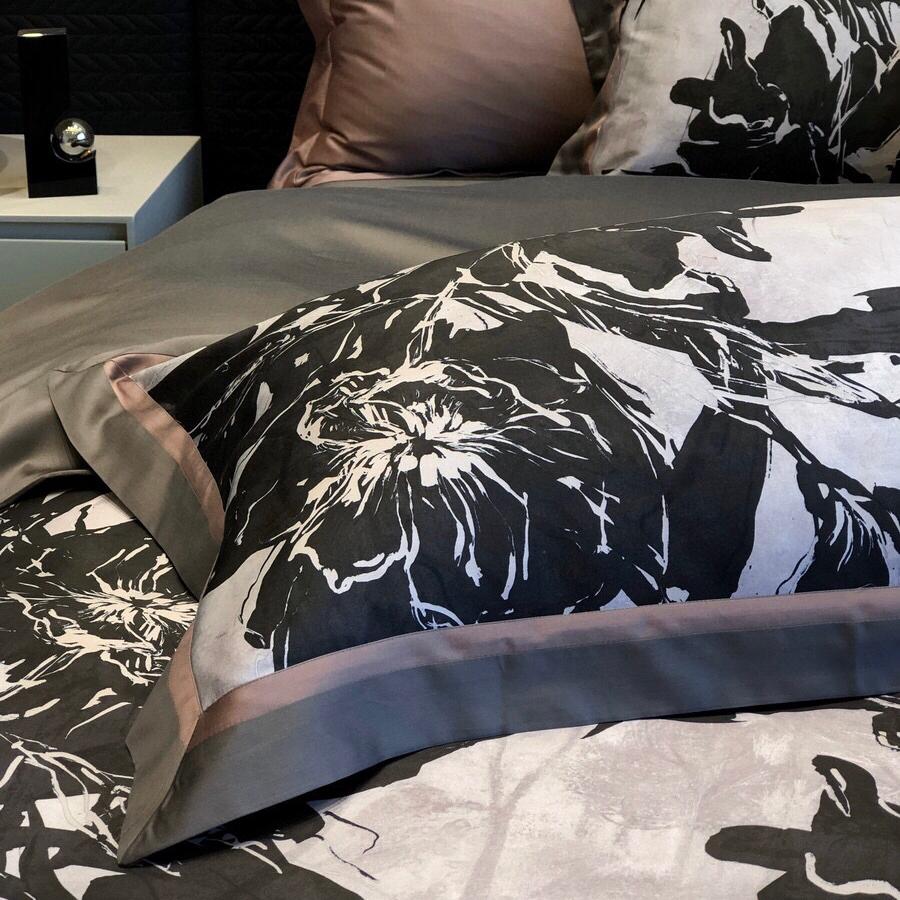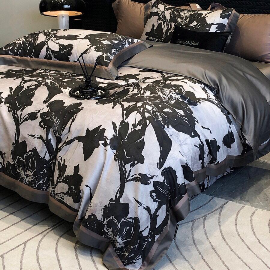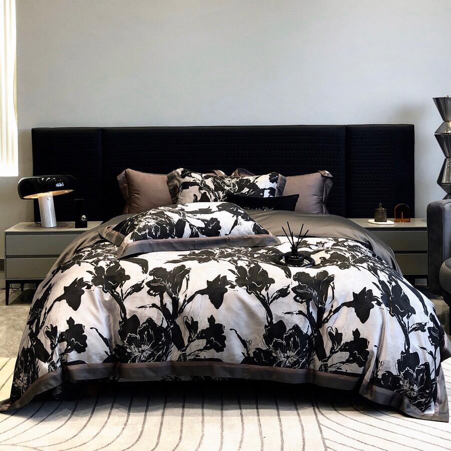 Hot-selling black 4-pieces textile leaves printing 2m/2.2m bedsheet flat sheets 1.8m lyocell cotton quilt cover premium bedding set manufacture