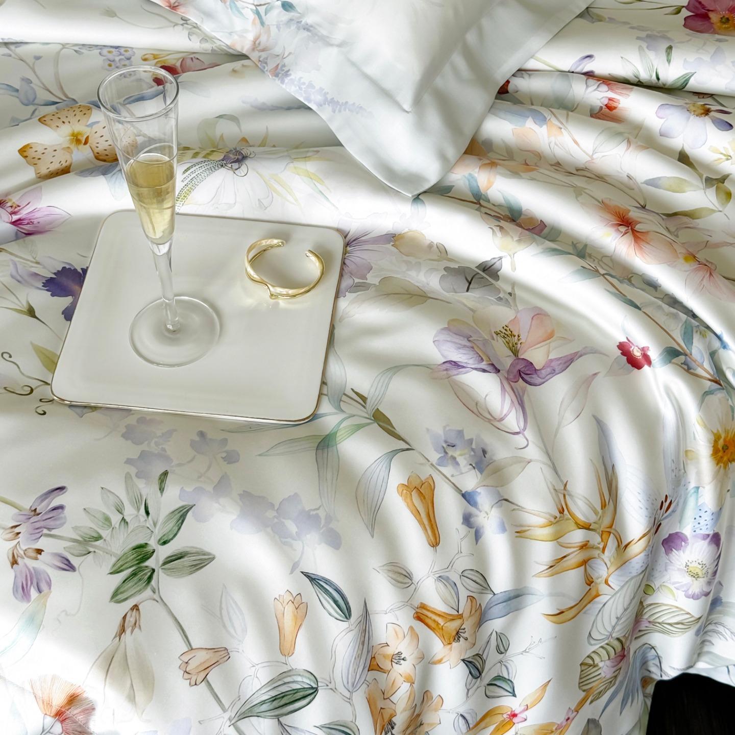 Hot selling lyocell 4-pieces textile ODM coverlets printing bedsheets white bed linen bedding set wholesaler