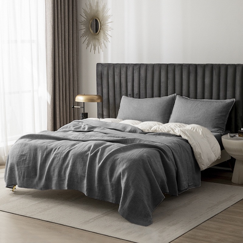 The product is 4pcs bedding set. It’s made of linen fabric by default. We support doing ODM/OEM. We can provide fabrics both solid colors and printing(from 75-150gsm)/the weight of fillings ranges from 150-500gsm.Both of which can be customized according to customer’s needs.