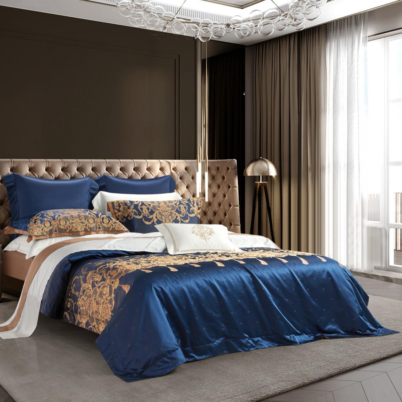 Luxury Mulberry Silk Yarn-Dyed Jacquard Duvet Cover Blue King Quilt Cover Smoothy Bed Sheets Home Textile 4PCS Bedding Set