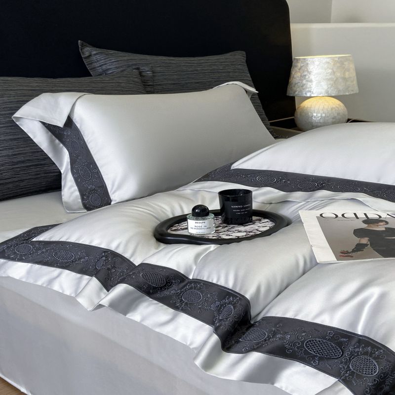 Luxury Silver Embroidery Duvet Comforter Quilt Cover Queen King Bed Sheets Breathable Bed Linen Lyocell Cotton Bedding Set