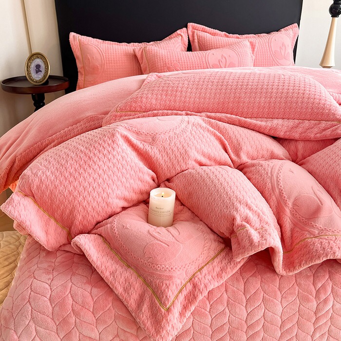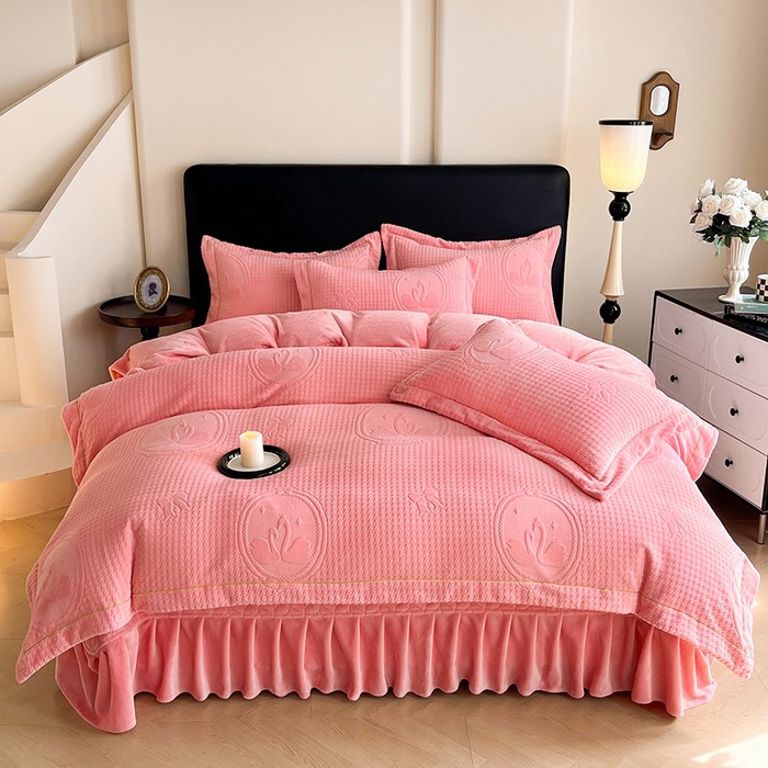 Premium quality milk fleece home textiles pink ruffles carving craft bedding set supplier