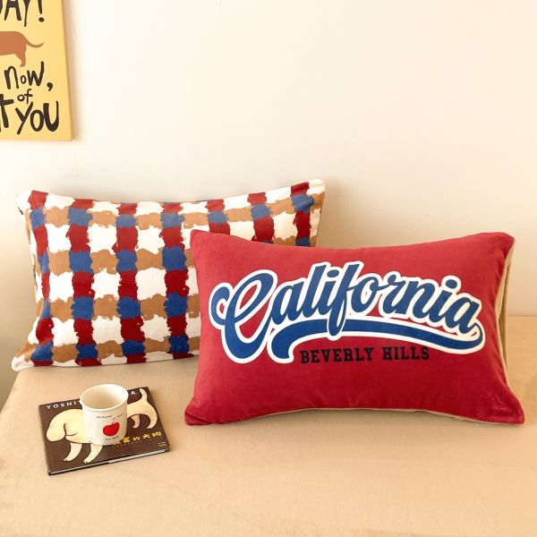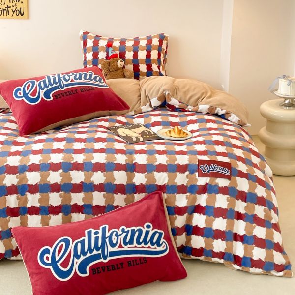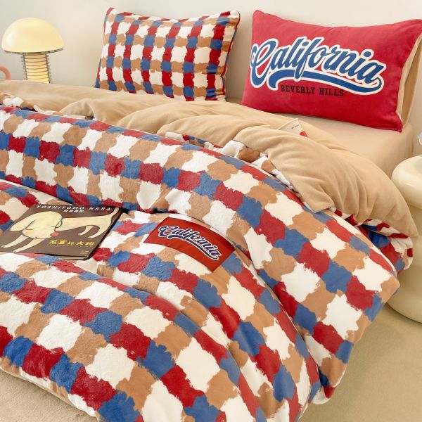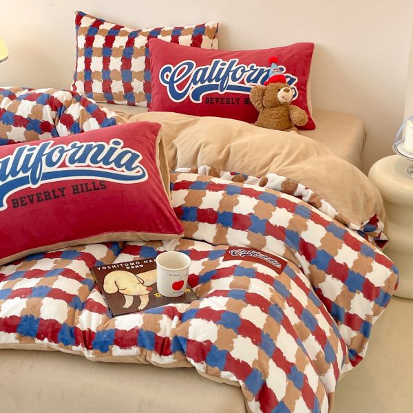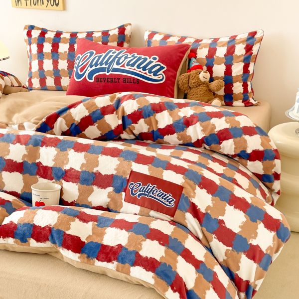 Red plaid printing duvet quilt cover bed sheets milk velvet 4pcs bedding set