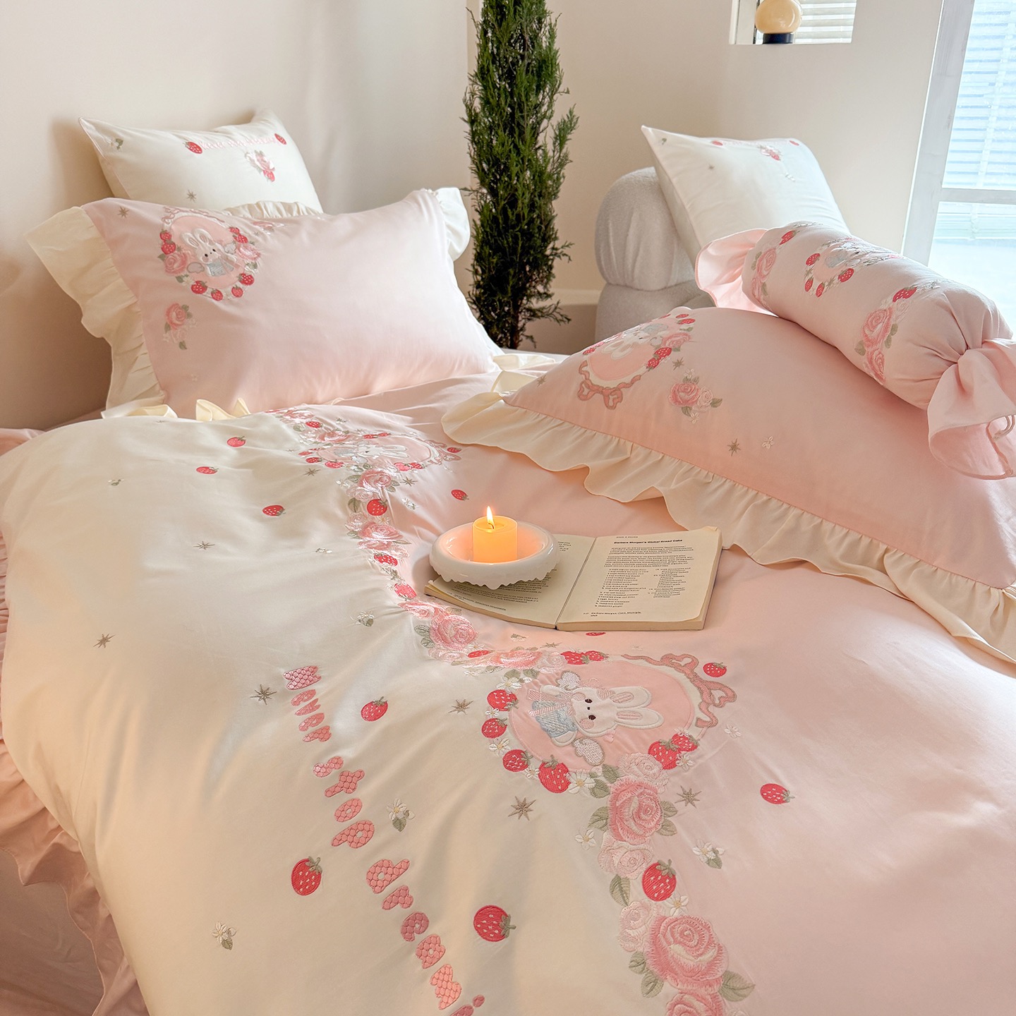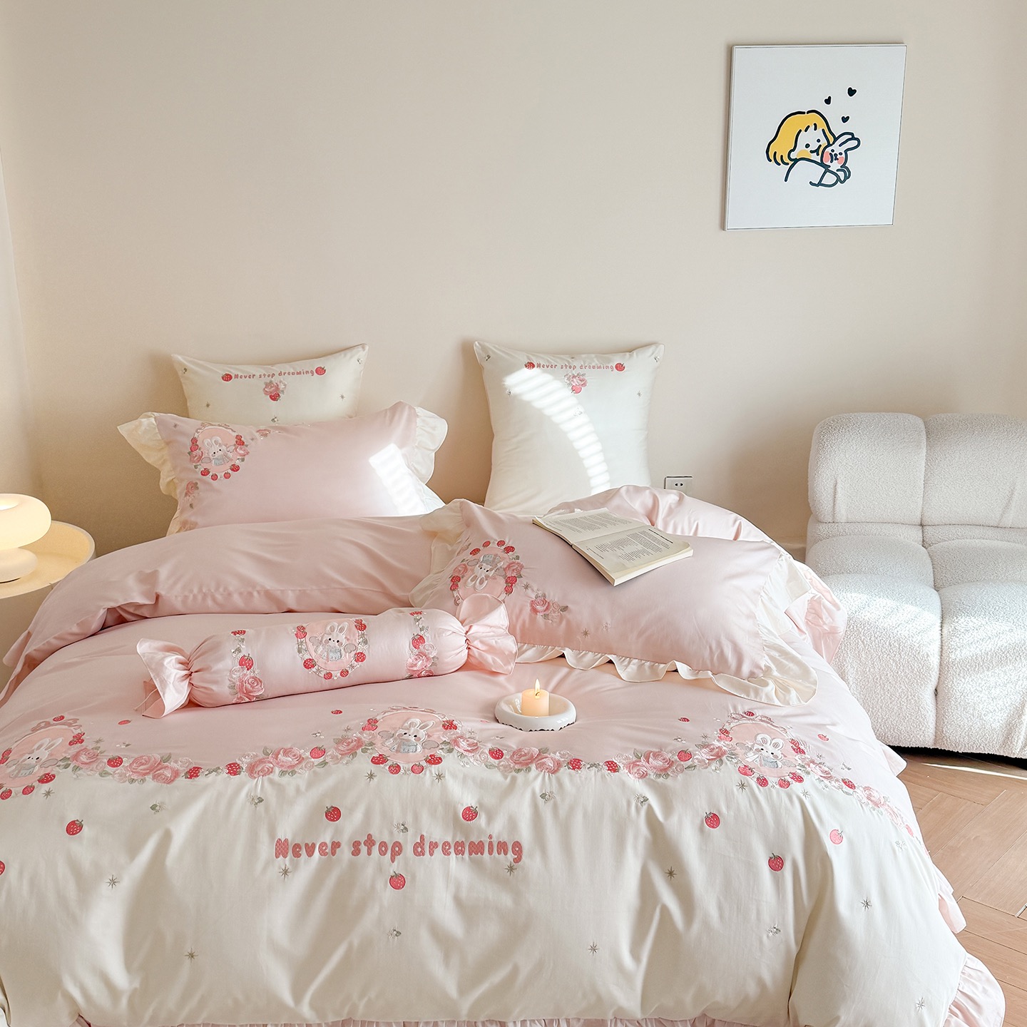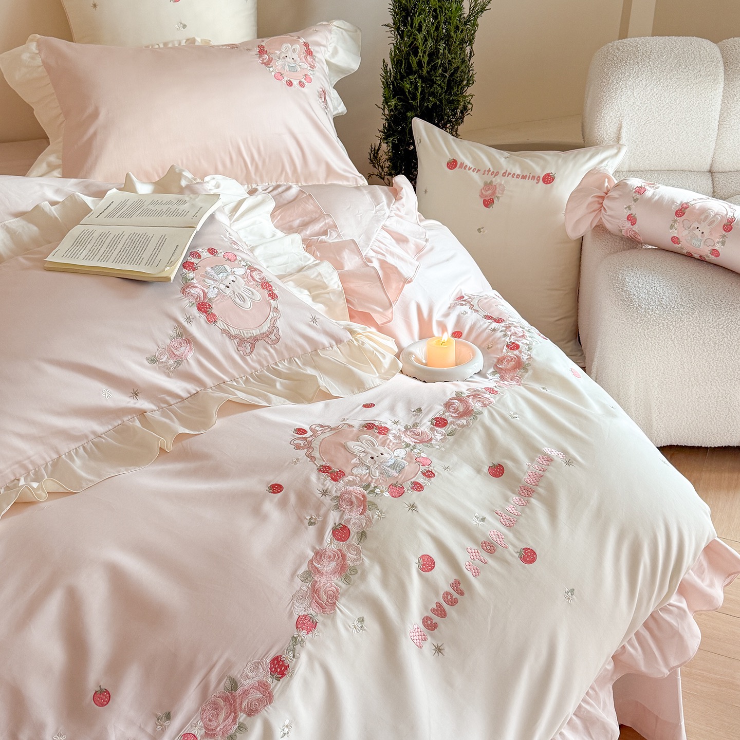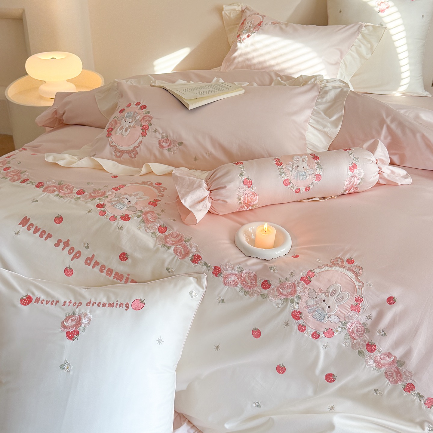 Super Soft Cotton Brushed Bed Sheets Pink Embroidery Quilt Cover Cute 4PCS Bedding Set