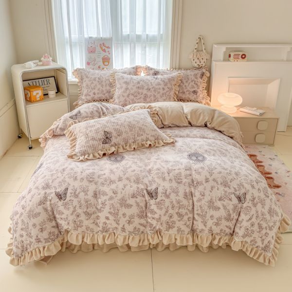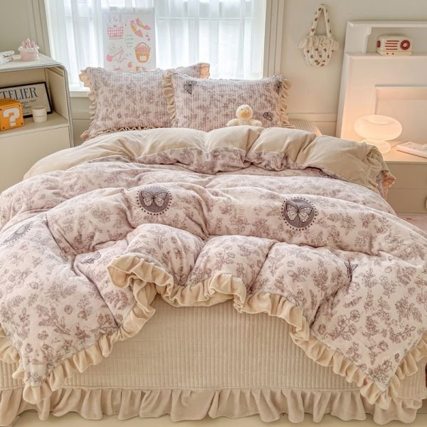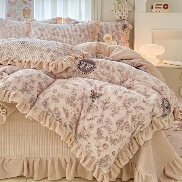 Ultra-high weight milk velvet lace floral print bed cover four-piece bedding set