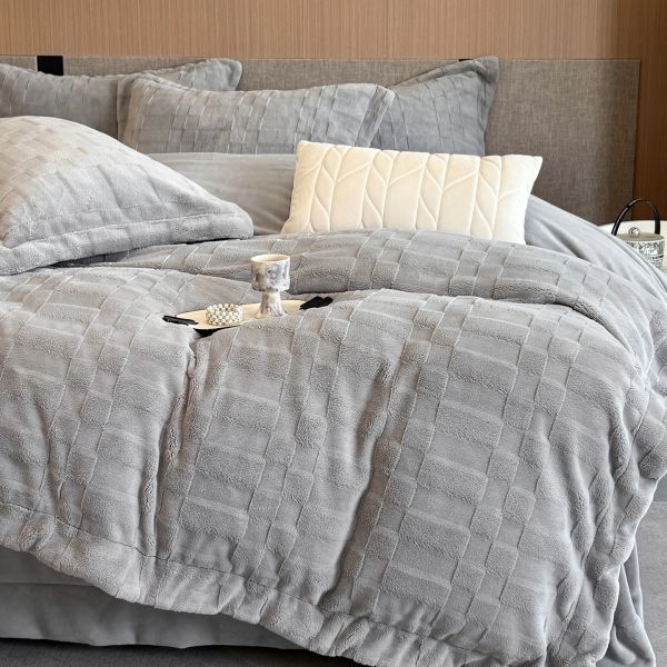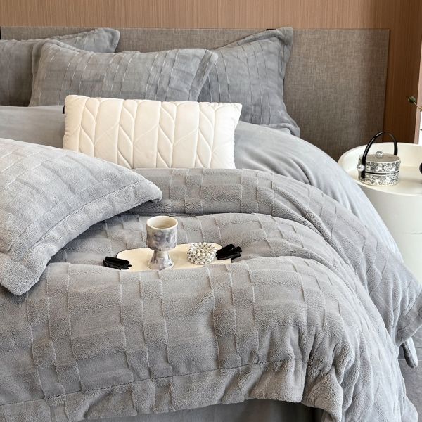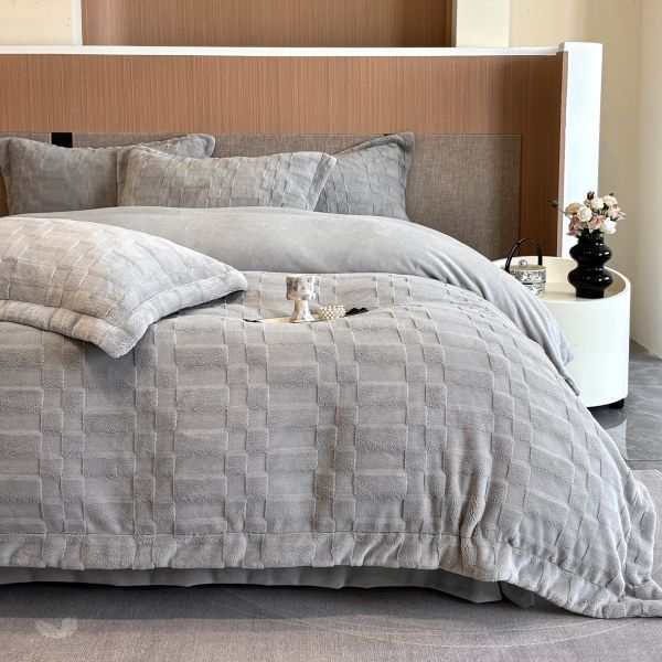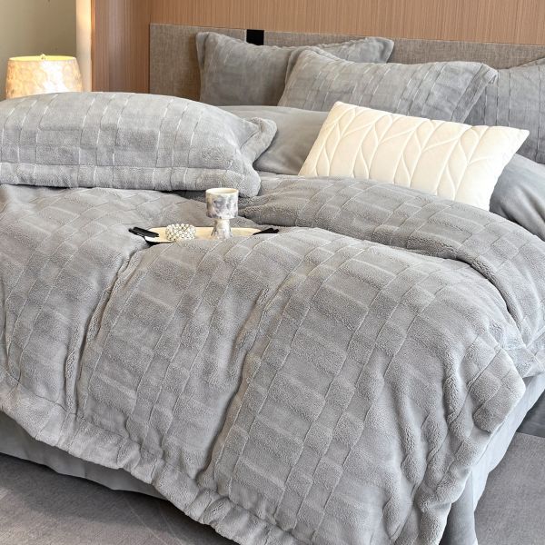 Ultra-high weight solid color plaid jacquard milk velvet 230g velvet gray four-piece bedding set
