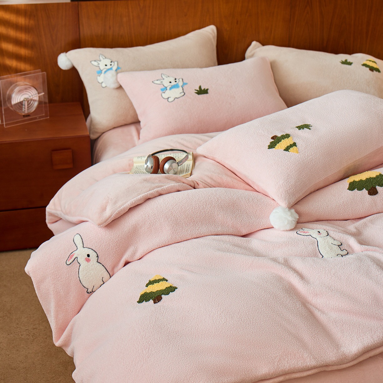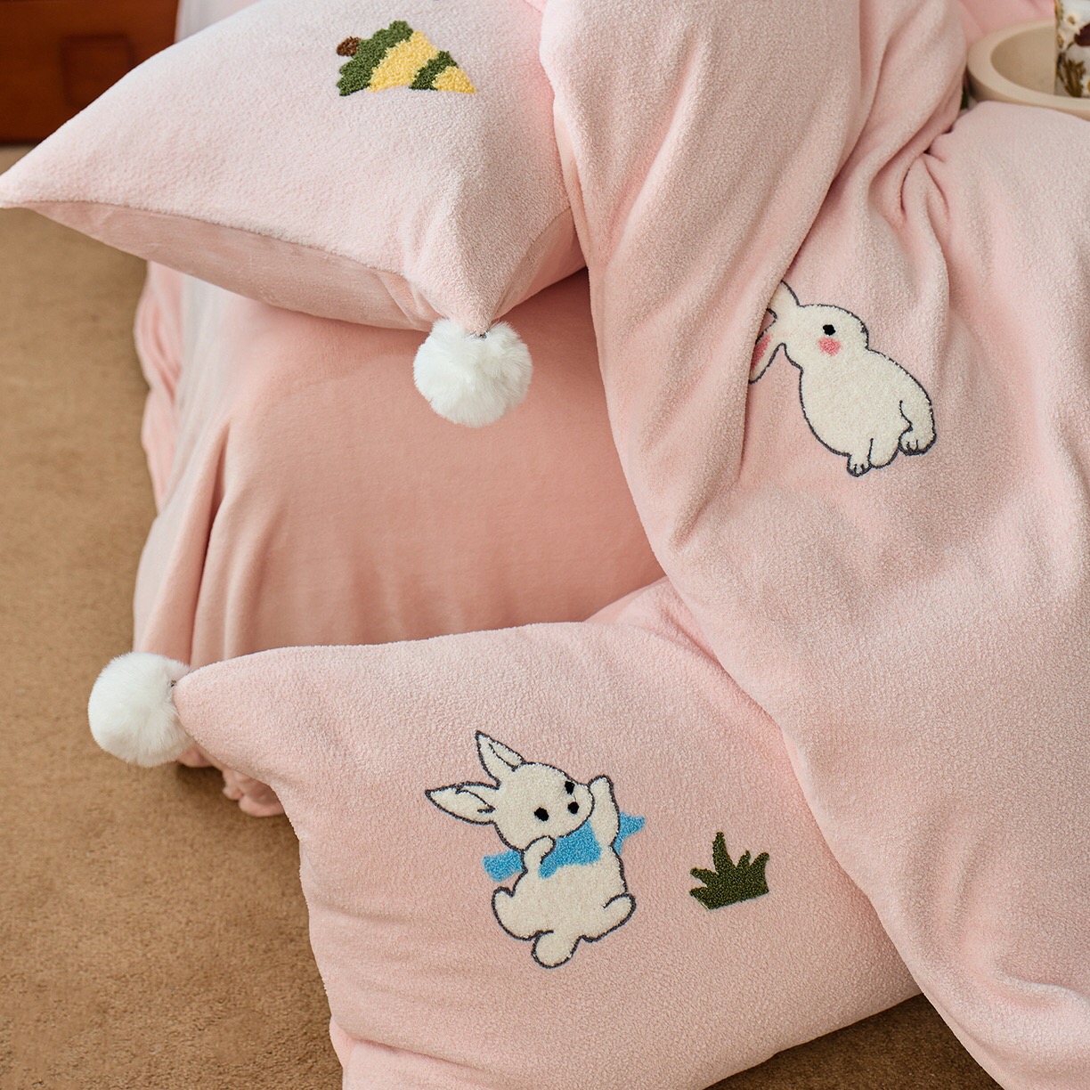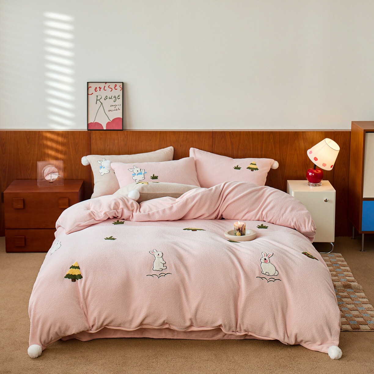 Warm fleece 4-pieces home textile towel embroidery duvet cover ruffles pillow shams pink flat sheets queen size bedding set